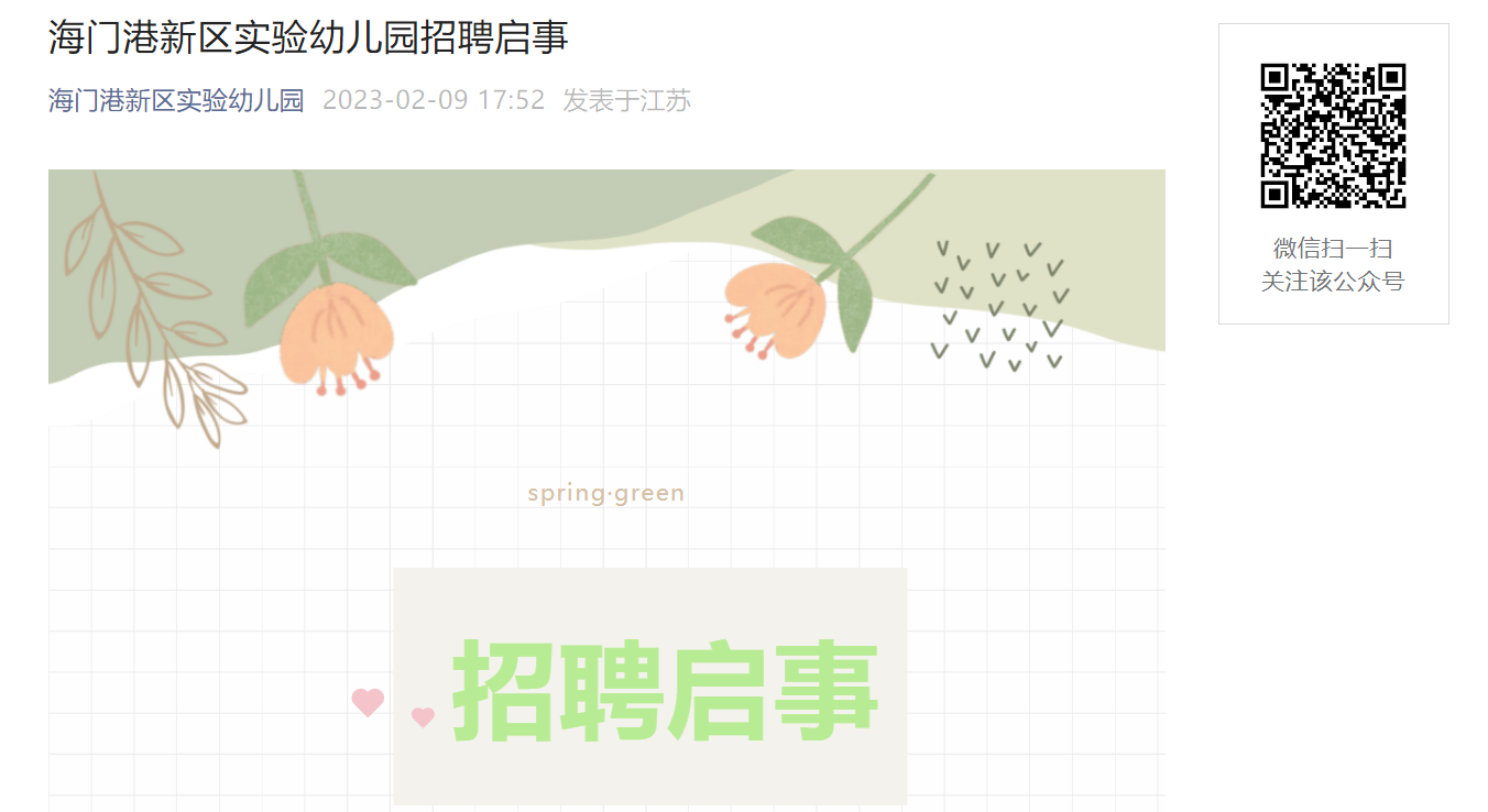 2023江蘇南通海門(mén)港新區(qū)實(shí)驗(yàn)幼兒園招聘啟事已發(fā)布,有意者歡迎咨詢(xún)、報(bào)名?,F(xiàn)將招聘公告原文發(fā)布如下: