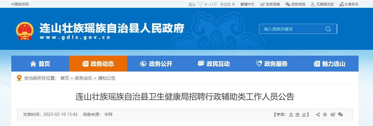 2023廣東清遠(yuǎn)市連山壯族瑤族自治縣衛(wèi)生健康局招聘行政輔助類工作人員2人,報(bào)名時(shí)間:2023年2月10日至2月16日,工作日每天上午8:30-11:30,下午14:30-17:30,現(xiàn)將招聘公告原文發(fā)布如下: