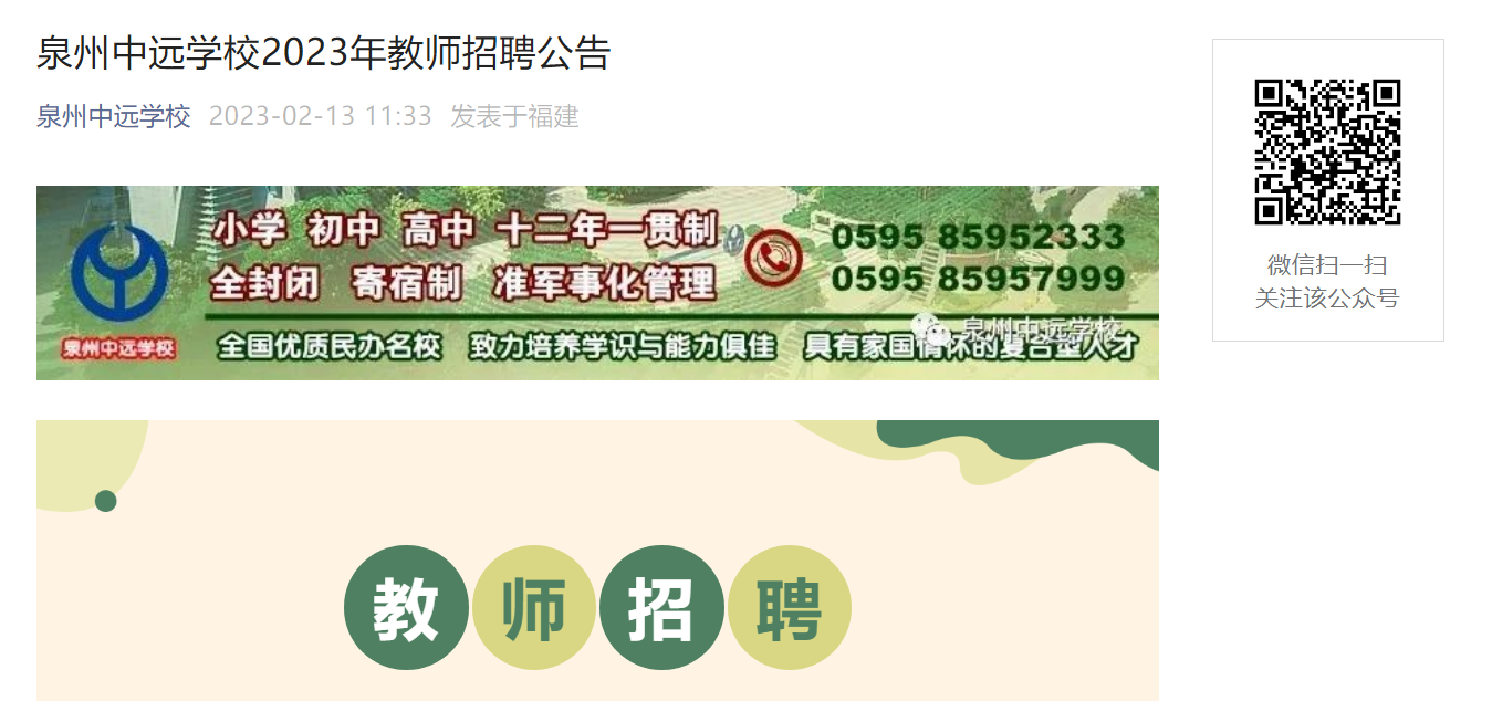 2023年福建泉州中遠(yuǎn)學(xué)校教師招聘公告已發(fā)布,聯(lián)系地址:福建省晉江市池店鎮(zhèn)鳳池東路500號(hào)。現(xiàn)將招聘公告原文發(fā)布如下: