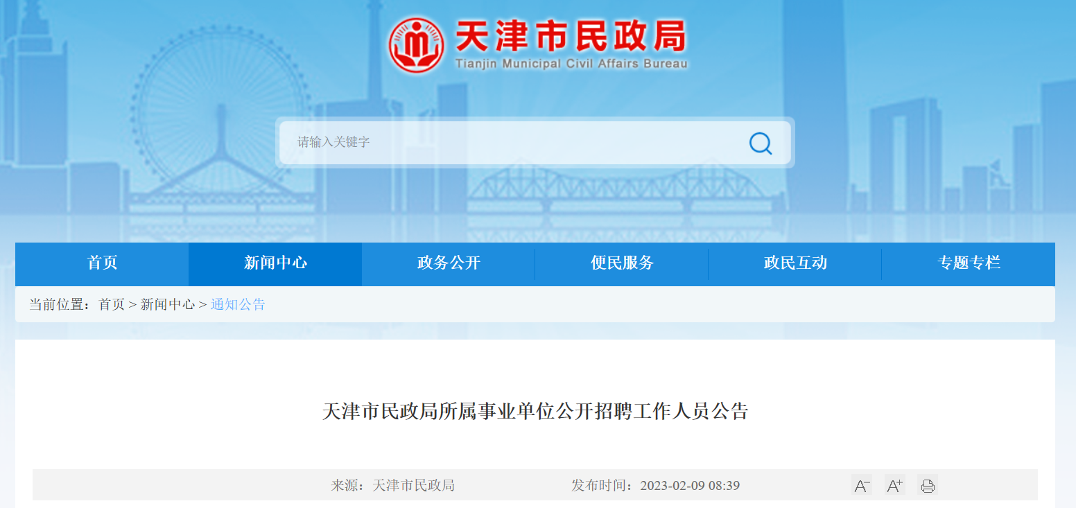 根據(jù)招聘方案,于2023年2月9日起招聘公告在天津市民政局(https://mz.tj.gov.cn)、天津市人才服務中心網(wǎng)(http://www.tjtalents.com.cn)、北方人才網(wǎng)(http://www.tjrc.com.cn)上進行發(fā)布。