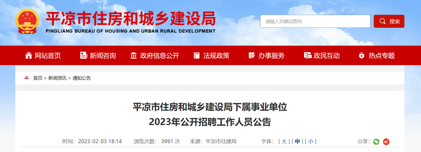 2.平?jīng)鍪凶》亢统青l(xiāng)建設(shè)局網(wǎng)站及公眾號是本次公開招聘發(fā)布公告、通知等信息的主要網(wǎng)站,招聘工作期間,考生應(yīng)及時關(guān)注相關(guān)公告、公示等信息。