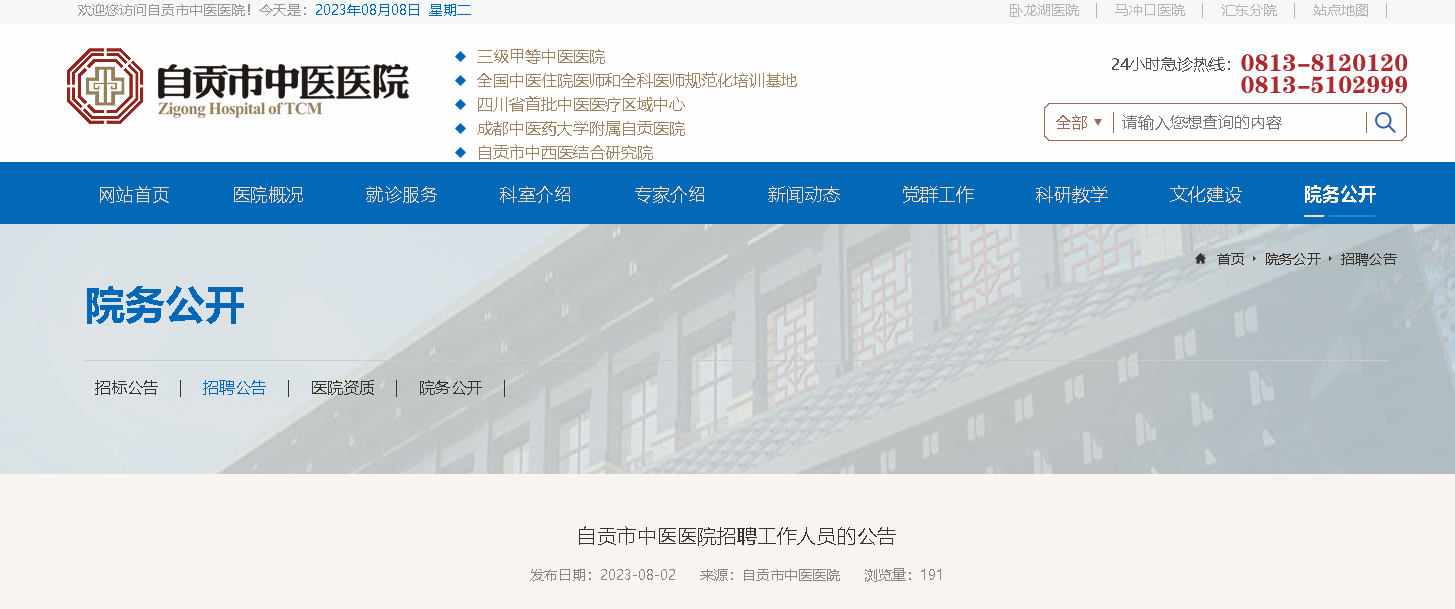 2023四川自貢市中醫(yī)醫(yī)院招聘12人,報名時間:即日起至2023年8月9日下午5:00,現(xiàn)將招聘公告原文發(fā)布如下: