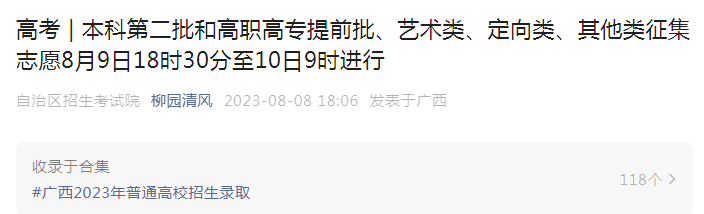 高考頻道從柳園清風了解到,2023年廣西高考本科二批和高職高專提前批、藝術(shù)類、定向類、其他類征集志愿開始,具體如下: