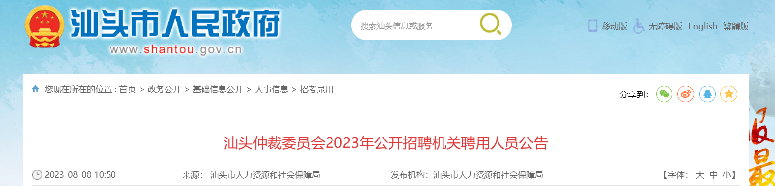 本次招聘的公告通過(guò)汕頭仲裁委員會(huì)(http://www.shantou.gov.cn/zcw/)和汕頭市人力資源和社會(huì)保障局(http://www.shantou.gov.cn/hrss/)發(fā)布。