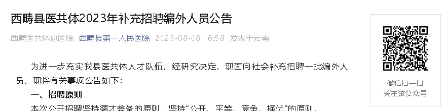 2023云南文山州西疇縣醫(yī)共體補充招聘編外人員40人,報名時間:2023年8月8日-8月14日,8:00-11:30,14:30-17:30(周末及節(jié)假日除外),現將招聘公告原文發(fā)布如下:
