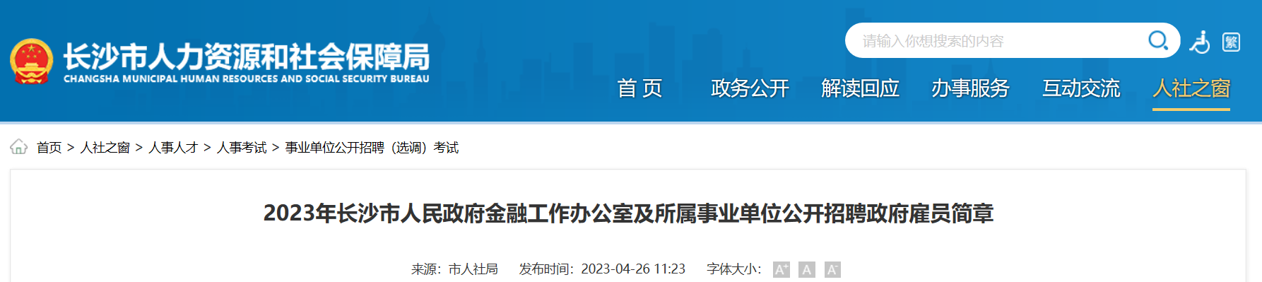 招聘簡章、擬聘用人員公示通過長沙市人力資源和社會保障局官方網(wǎng)站http://rsj.changsha.gov.cn/、長沙市人民政府金融工作辦公室網(wǎng)站http://jrb.changsha.gov.cn公布。有關(guān)考試具體安排、各環(huán)節(jié)相關(guān)信息等均在長沙市人民政府金融工作辦公室網(wǎng)站http://jrb.changsha.gov.cn公布,請報(bào)考人員自行查閱,不另行通知。