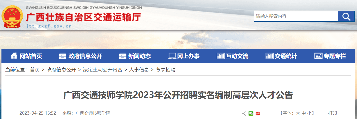 根據(jù)《廣西壯族自治區(qū)事業(yè)單位公開(kāi)招聘人員實(shí)施辦法》(桂人社發(fā)〔2011〕155號(hào))及有關(guān)文件精神,結(jié)合單位實(shí)際工作需要,現(xiàn)將廣西交通技師學(xué)院2023年公開(kāi)招聘實(shí)名編制高層次人才有關(guān)事項(xiàng)公告如下:一、單位簡(jiǎn)介