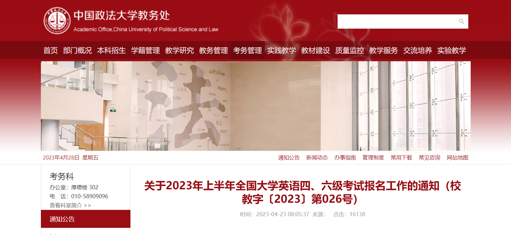 從中國政法大學(xué)教務(wù)處獲悉,2023上半年中國政法大學(xué)(北京)英語四、六級考試報名工作通知已公布,報名時間4月27日起,具體詳情如下: