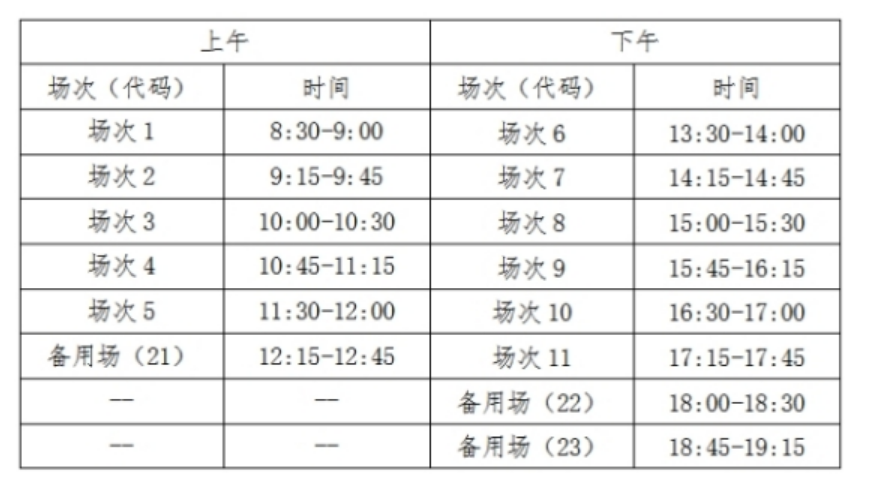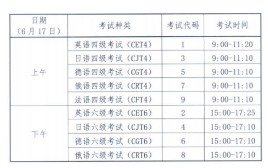 英語四級口語(CET-SET4)考試時間為5月20日,英語六級口語(CET-SET6)考試時間為5月21日,具體場次安排如下: