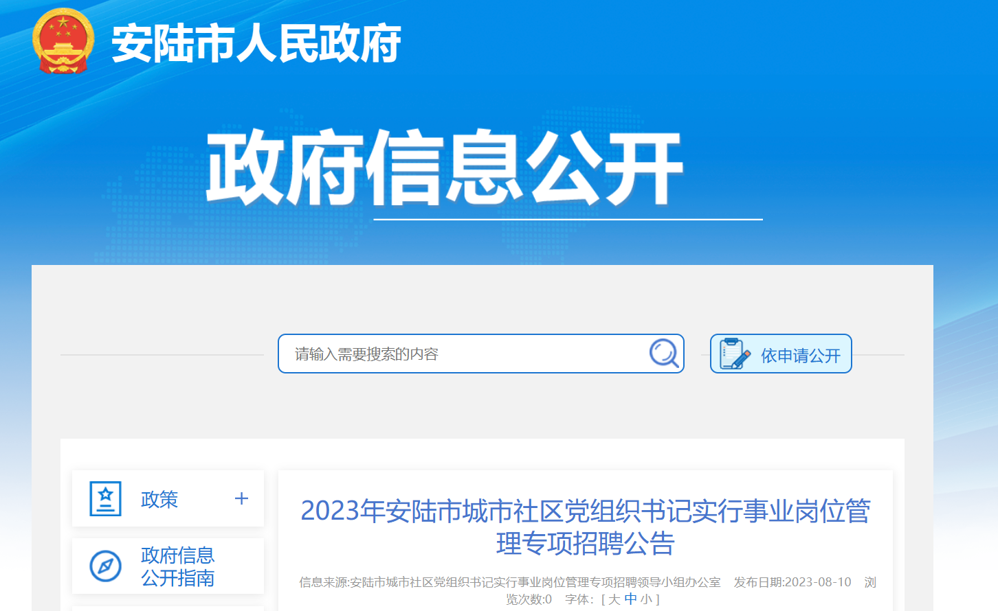 2023年湖北省孝感市安陸市城市社區(qū)黨組織書記實(shí)行事業(yè)崗位管理專項(xiàng)招聘5人。報(bào)名時(shí)間2023年8月10日-8月18日?,F(xiàn)將公告原文發(fā)布如下: