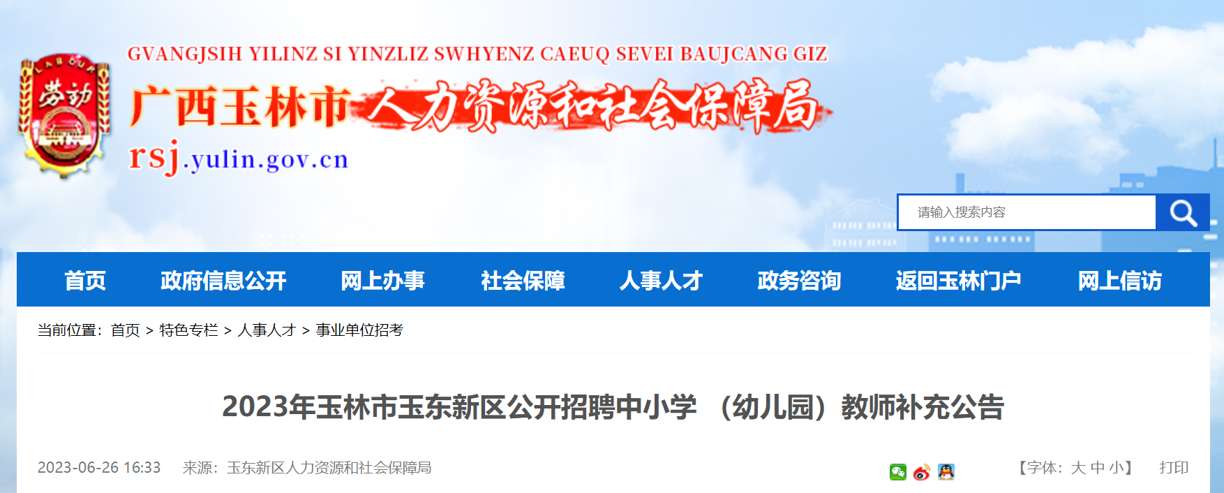 我局2023年6月9日在玉林市人力資源和社會(huì)保障局網(wǎng)站發(fā)布了《2023年玉林市玉東新區(qū)公開招聘中小學(xué)(幼兒園)教師公告》,現(xiàn)將有關(guān)招聘工作事項(xiàng)補(bǔ)充公告如下: