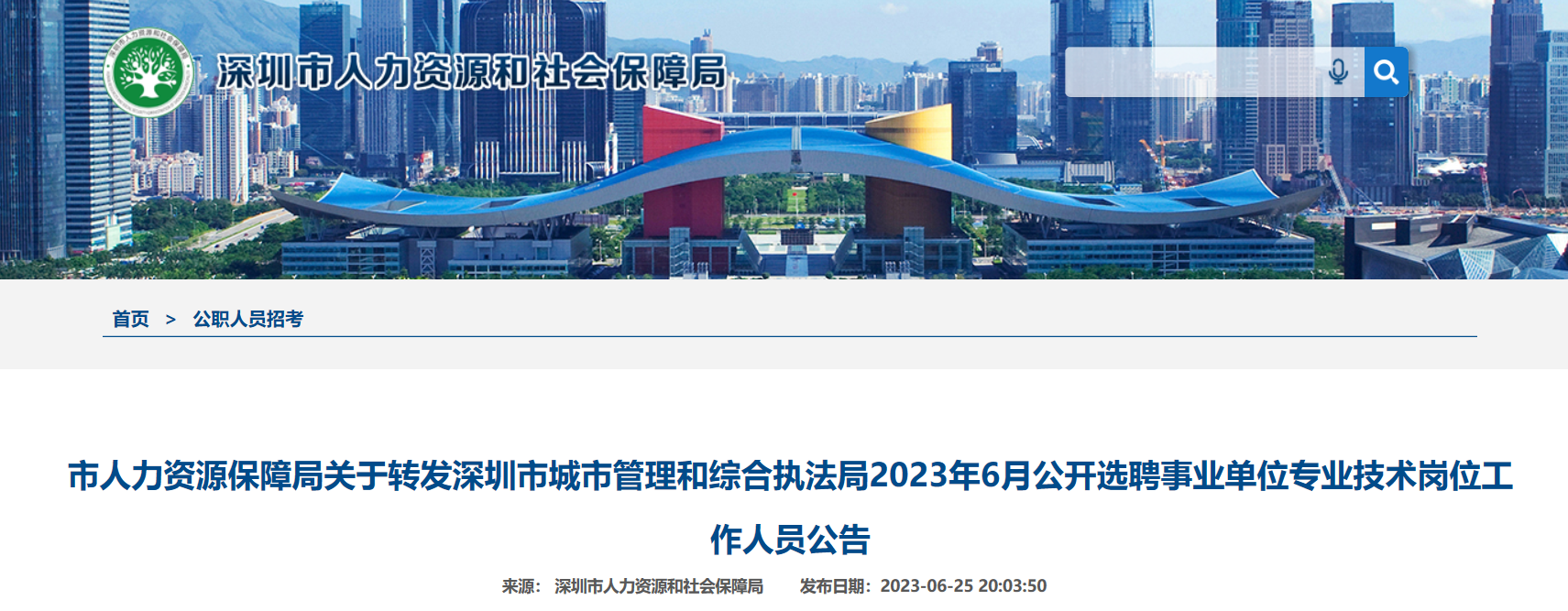 因工作需要,深圳市城市管理和綜合執(zhí)法局下屬事業(yè)單位于2023年6月公開選聘專業(yè)技術(shù)崗位工作人員,具體崗位詳見《深圳市城市管理和綜合執(zhí)法局公開選聘事業(yè)單位專業(yè)技術(shù)崗位工作人員崗位表》(附件1,以下簡稱《選聘崗位表》)。現(xiàn)就有關(guān)事項公告如下: