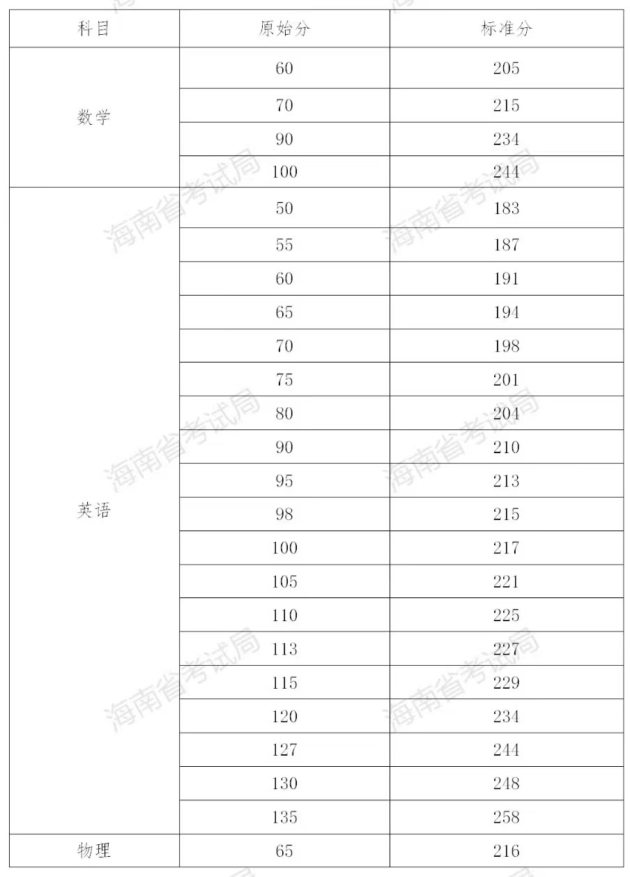 4.香港中文大學(xué)、香港城市大學(xué)等有關(guān)院?;?qū)I(yè)錄取時(shí)對(duì)高考語(yǔ)文、數(shù)學(xué)、英語(yǔ)原始分成績(jī)有要求。為方便考生填報(bào)志愿,現(xiàn)將《2023年海南省普通高考數(shù)學(xué)、英語(yǔ)、物理部分成績(jī)?cè)挤趾蜆?biāo)準(zhǔn)分對(duì)照表》公布如下: