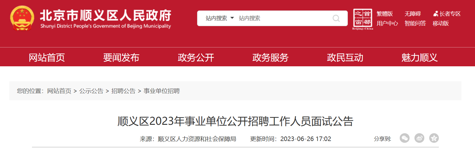 2023年北京市順義區(qū)事業(yè)單位招聘工作人員面試。面試時(shí)間:2023年6月30日至7月2日。現(xiàn)將公告原文發(fā)布如下: