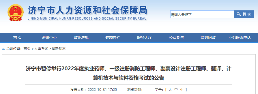 鑒于新冠肺炎疫情防控最新形勢,為保證廣大考生身體健康安全,根據(jù)疫情防控有關(guān)要求,經(jīng)綜合研判,決定暫停原定于11月5—6日舉行的2022年度執(zhí)業(yè)藥師、一級注冊消防工程師、勘察設(shè)計注冊工程師(一、二級注冊結(jié)構(gòu)師)、翻譯、計算機技術(shù)與軟件等5項職業(yè)資格考試??荚嚭罄m(xù)安排另行通知,請廣大考生密切關(guān)注濟寧市人力資源和社會保障局網(wǎng)站人事考試欄目,并保持手機暢通,及時了解相關(guān)信息。如有疑問請撥打電話0537-2967978咨詢。