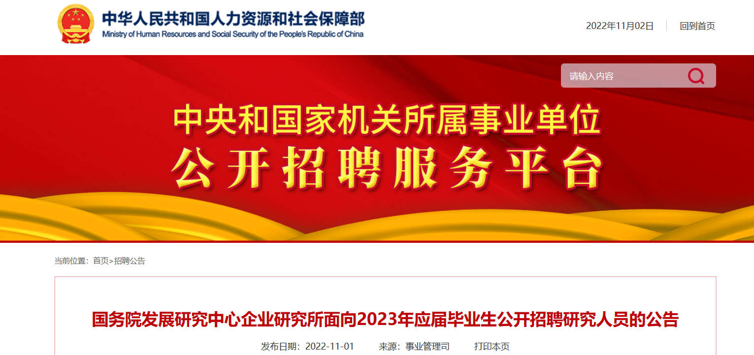 北京國務(wù)院發(fā)展研究中心企業(yè)研究所面向2023年應(yīng)屆畢業(yè)生招聘研究人員公告已發(fā)布。報名截止時間為2022年11月15日。