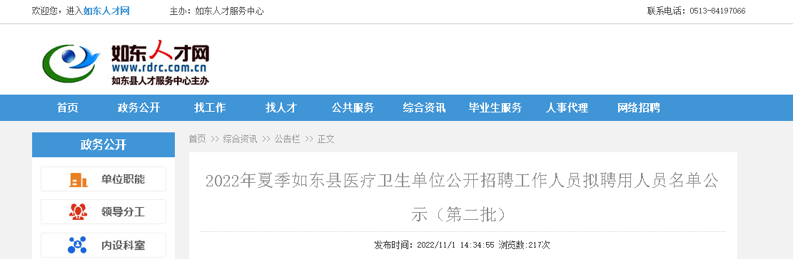 2022夏季江蘇南通市如東縣醫(yī)療衛(wèi)生單位招聘工作人員擬聘用人員名單公示(第二批)已出,公示時間:2022年11月1日至11月9日,現(xiàn)將招聘公示原文發(fā)布如下:
