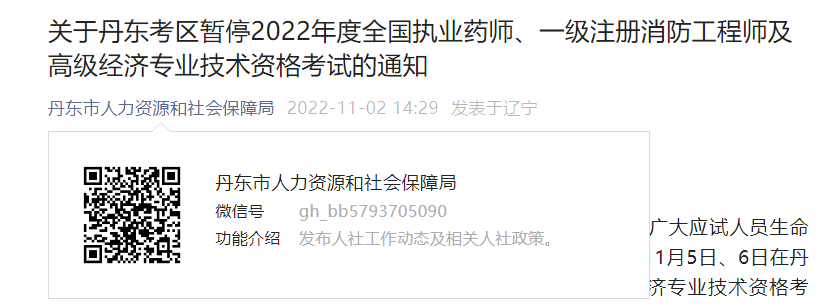 原文標(biāo)題:關(guān)于丹東考區(qū)暫停2022年度全國(guó)執(zhí)業(yè)藥師、一級(jí)注冊(cè)消防工程師及高級(jí)經(jīng)濟(jì)專業(yè)技術(shù)資格考試的通知