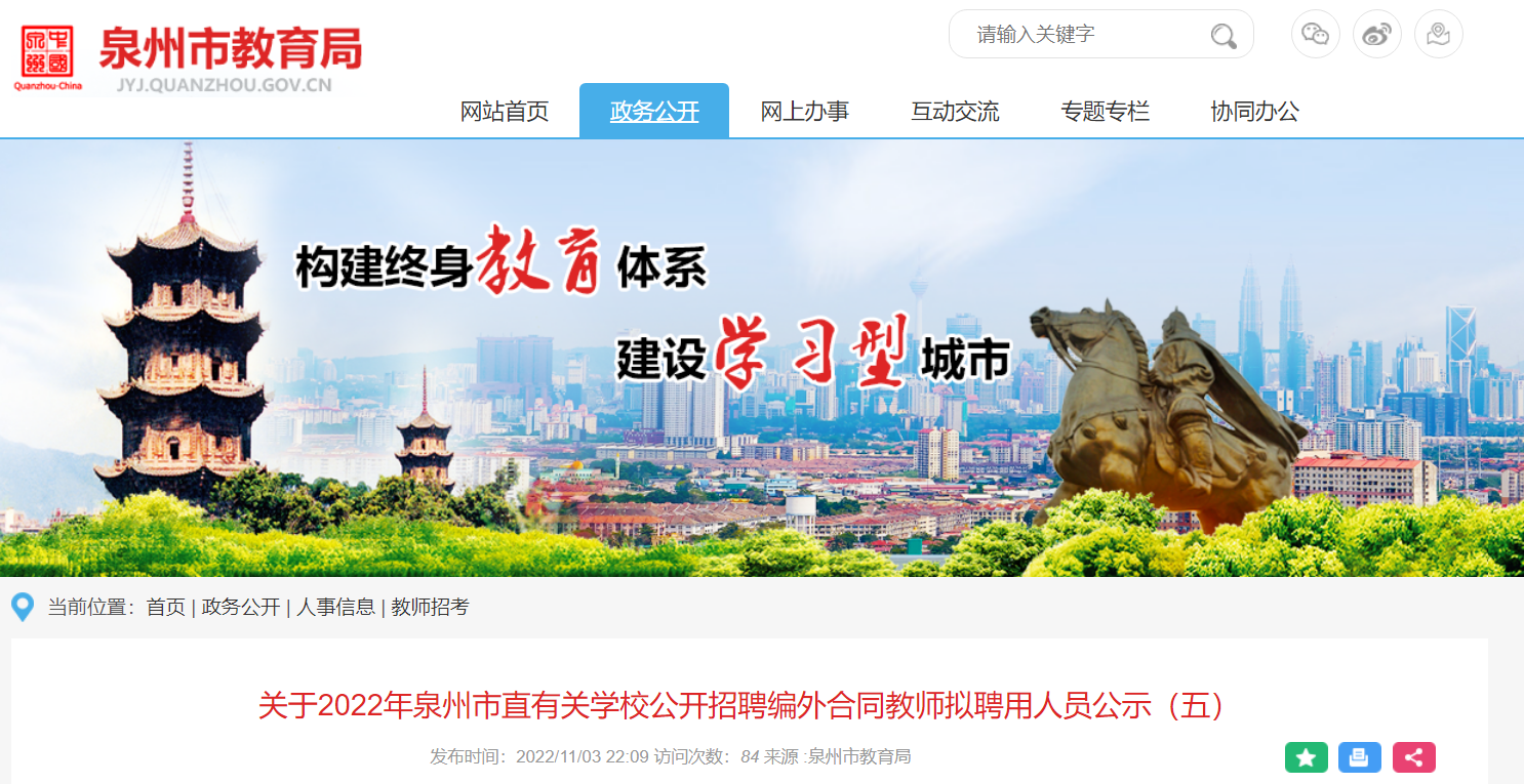 關(guān)于2022年泉州市直有關(guān)學(xué)校公開(kāi)招聘編外合同教師擬聘用人員公示(五)