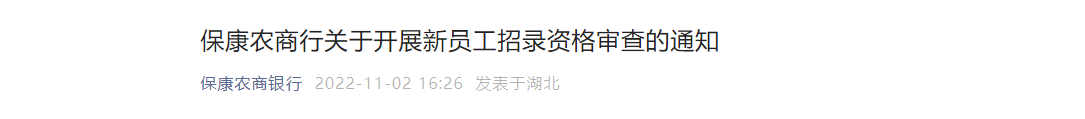 2022湖北保康農(nóng)商行關(guān)于開(kāi)展新員工招錄資格審查的通知已發(fā)布,資格審查時(shí)間:2022年11月3日-5日,現(xiàn)將公告發(fā)布如下: