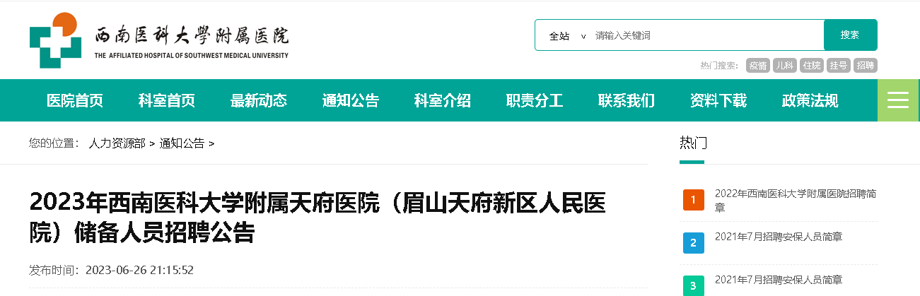 2023年四川省眉山市西南醫(yī)科大學(xué)附屬天府醫(yī)院招聘319人,報(bào)名截止時(shí)間為2023年7月9日24:00,現(xiàn)將招聘公告原文發(fā)布如下: