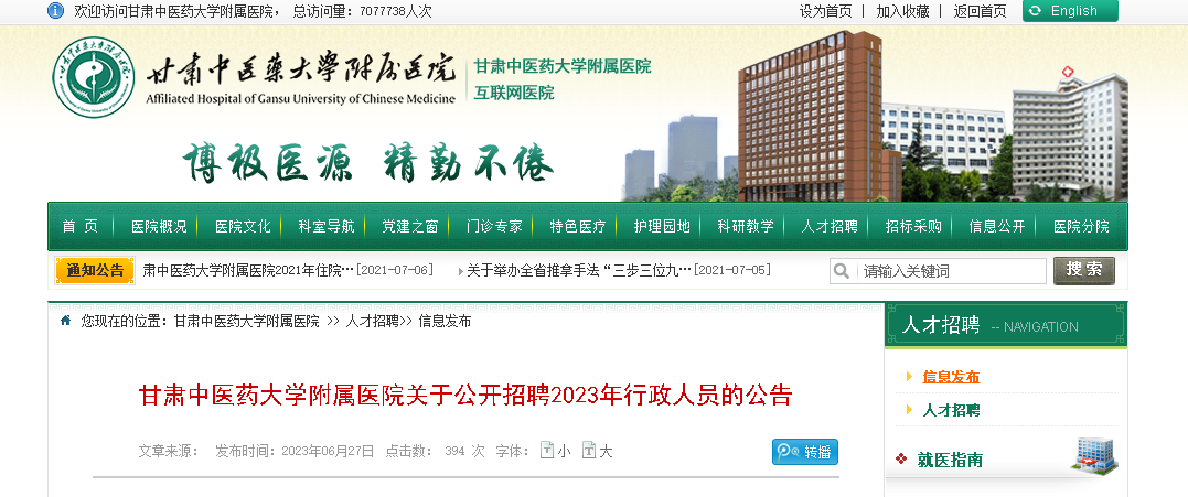 2023年甘肅中醫(yī)藥大學(xué)附屬醫(yī)院招聘行政人員,報名時間:即日起至2023年6月30日12:00截止,現(xiàn)將招聘公告原文發(fā)布如下: