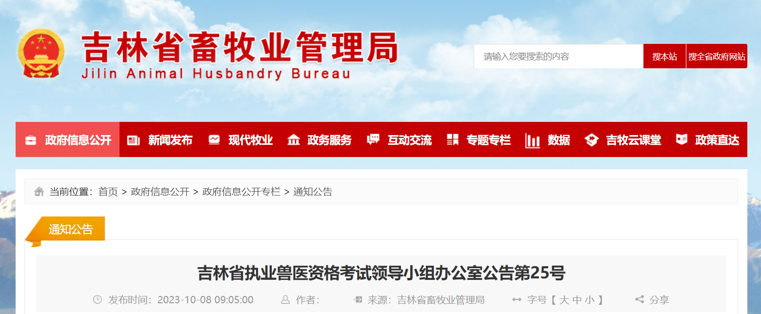 根據(jù)《全國(guó)執(zhí)業(yè)獸醫(yī)資格考試委員會(huì)公告農(nóng)醫(yī)考公告第32號(hào)》要求,現(xiàn)就2023年吉林省執(zhí)業(yè)獸醫(yī)資格認(rèn)定有關(guān)事宜公告如下: