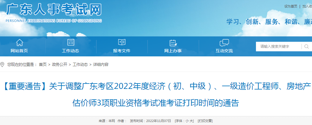 根據(jù)疫情防控有關(guān)要求,因個別考點(diǎn)需要調(diào)整,廣東考區(qū)2022年度經(jīng)濟(jì)專業(yè)技術(shù)資格考試(初、中級)、一級造價工程師職業(yè)資格考試、房地產(chǎn)估價師職業(yè)資格全國統(tǒng)一考試共3項(xiàng)考試的準(zhǔn)考證開始打印時間,由11月7日(周一)9:00調(diào)整至11月9日(周三)9:00。
