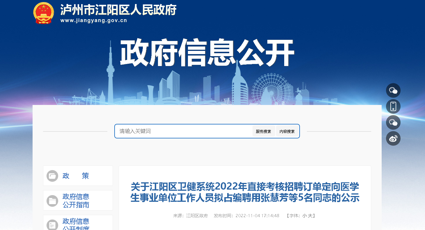 根據(jù)《關(guān)于江陽區(qū)衛(wèi)健系統(tǒng)2022年直接考核招聘訂單定向醫(yī)學(xué)生事業(yè)單位工作人員的公告》的規(guī)定,經(jīng)考核、體檢、考察程序,現(xiàn)擬占編聘用張慧芳等5名同志到區(qū)衛(wèi)生健康局所屬事業(yè)單位工作?,F(xiàn)向社會(huì)公示七個(gè)工作日,公示時(shí)間從2022年11月4日至2022年11月14日。