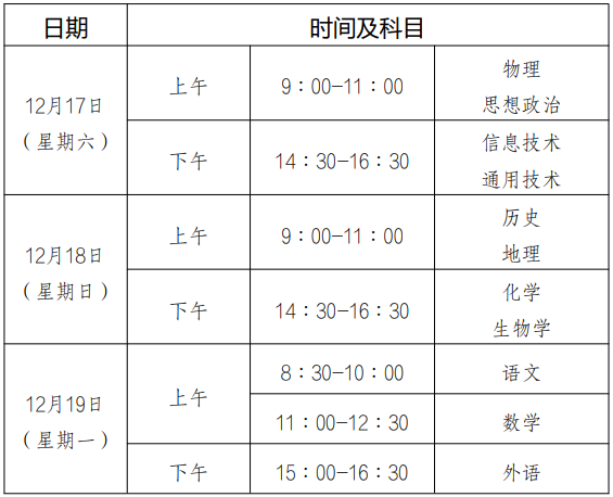 重慶萬盛2022-2023學(xué)年度第一學(xué)期普通高中學(xué)業(yè)水平合格性考試時間將于2022年12月17日-19日進(jìn)行。具體時間及考試科目安排如下: