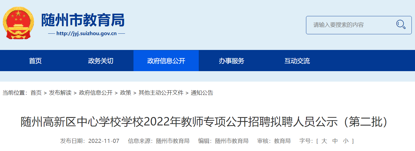 2022年湖北隨州高新區(qū)中心學校學校教師專項公開招聘擬聘人員公示(第二批)已發(fā)布,公示時間為2022年11月7日—2022年11月15日?,F(xiàn)將原文發(fā)布如下: