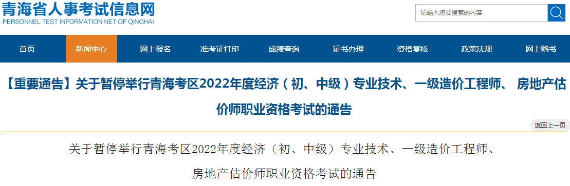 小編根據(jù)青海省人事考試信息網(wǎng)發(fā)布“關(guān)于暫停舉行青??紖^(qū)2022年度經(jīng)濟(jì)(初、中級(jí))專業(yè)技術(shù)、一級(jí)造價(jià)工程師、 房地產(chǎn)估價(jià)師職業(yè)資格考試的通告”得知,2022年青海初級(jí)經(jīng)濟(jì)師考試暫停,詳情如下: