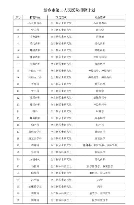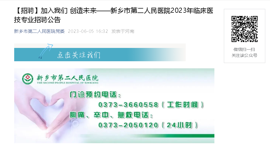 2023年河南新鄉(xiāng)市第二人民醫(yī)院臨床醫(yī)技專業(yè)招聘,報名時間:2023年6月5日--2023年6月15日,現(xiàn)將招聘公告原文發(fā)布如下: