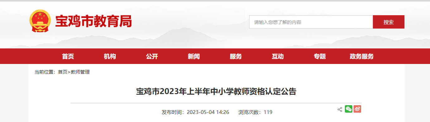 根據(jù)《陜西省2023年上半年中小學(xué)教師資格認(rèn)定公告》要求,現(xiàn)將寶雞市2023年上半年中小學(xué)教師資格認(rèn)定工作有關(guān)事項(xiàng)公告如下: