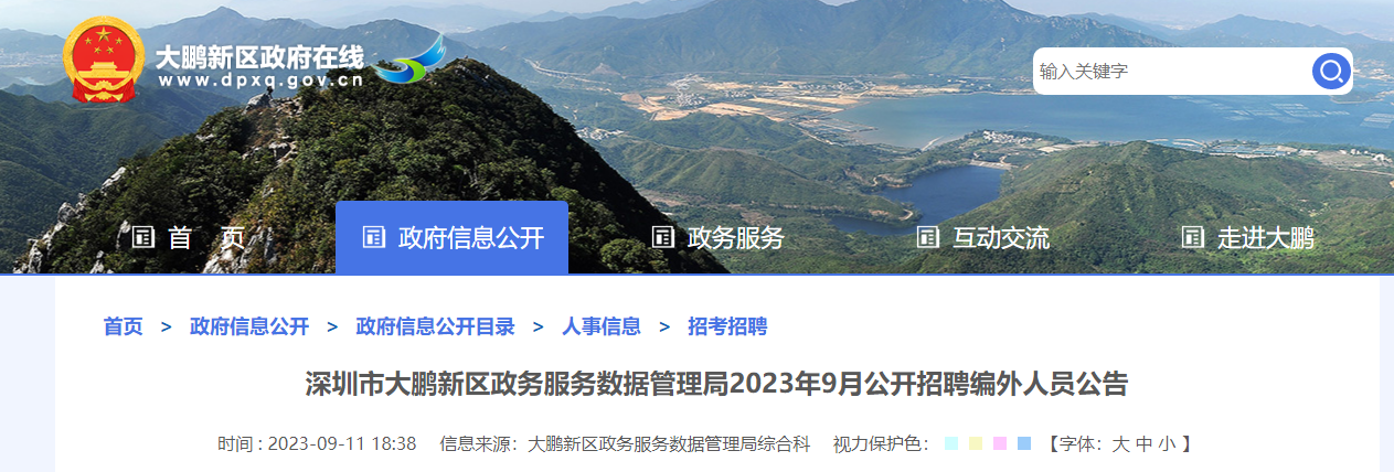 2023年9月廣東省深圳市大鵬新區(qū)政務(wù)服務(wù)數(shù)據(jù)管理局招聘編外人員2人。報(bào)名時(shí)間:2023年9月15日9:00至9月21日17:00?,F(xiàn)將公告原文發(fā)布如下: