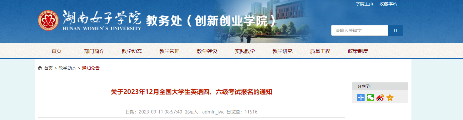 根據(jù)湖南省教育考試院通知,現(xiàn)就我校2023年12月全國(guó)大學(xué)英語四、六級(jí)考試的報(bào)名具體事項(xiàng)通知如下: