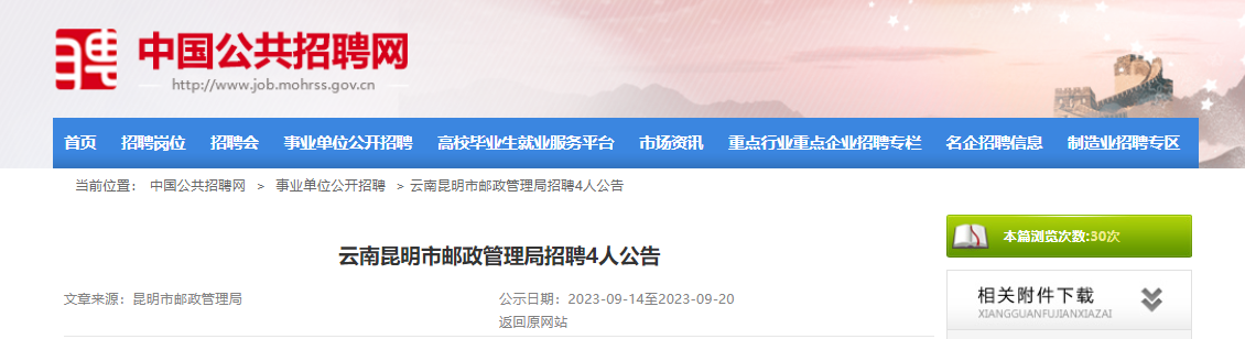 2023年云南省昆明市郵政管理局招聘4人。報名時間2023年9月20日前。現(xiàn)將公告原文發(fā)布如下: