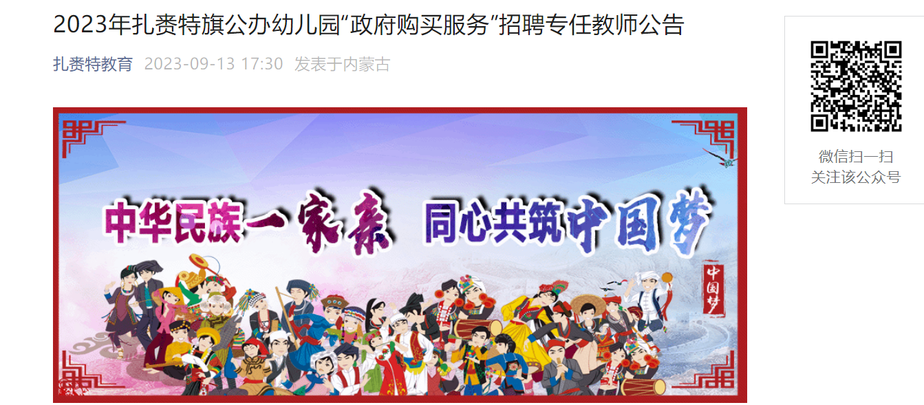 2023內(nèi)蒙古興安盟扎賚特旗公辦幼兒園“政府購買服務(wù)”招聘專任教師25人,報(bào)名時(shí)間:2023年9月13日—2023年9月17日?,F(xiàn)將招聘公告原文發(fā)布如下: