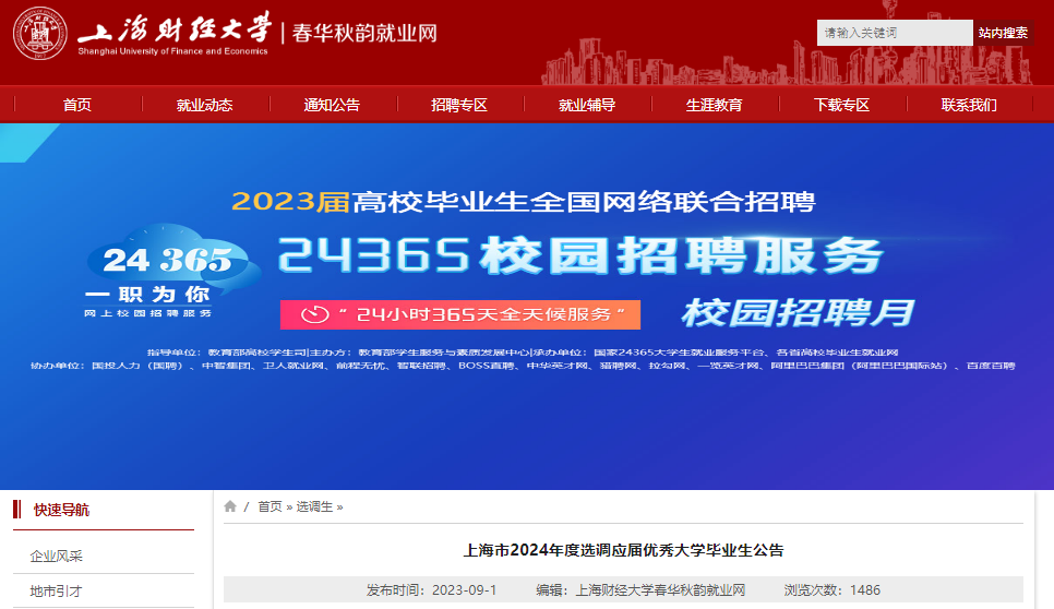 上海財經(jīng)大學春華秋韻就業(yè)網(wǎng)發(fā)布了《2024年上海市選調(diào)應屆優(yōu)秀大學畢業(yè)生公告》,從公告中獲悉,2024年上海選調(diào)生報名時間:9月8日-23日,考試時間:10月28日,具體事宜詳見《招考公告》,小編在此將相關(guān)信息摘錄如下,預祝大家考試順利!