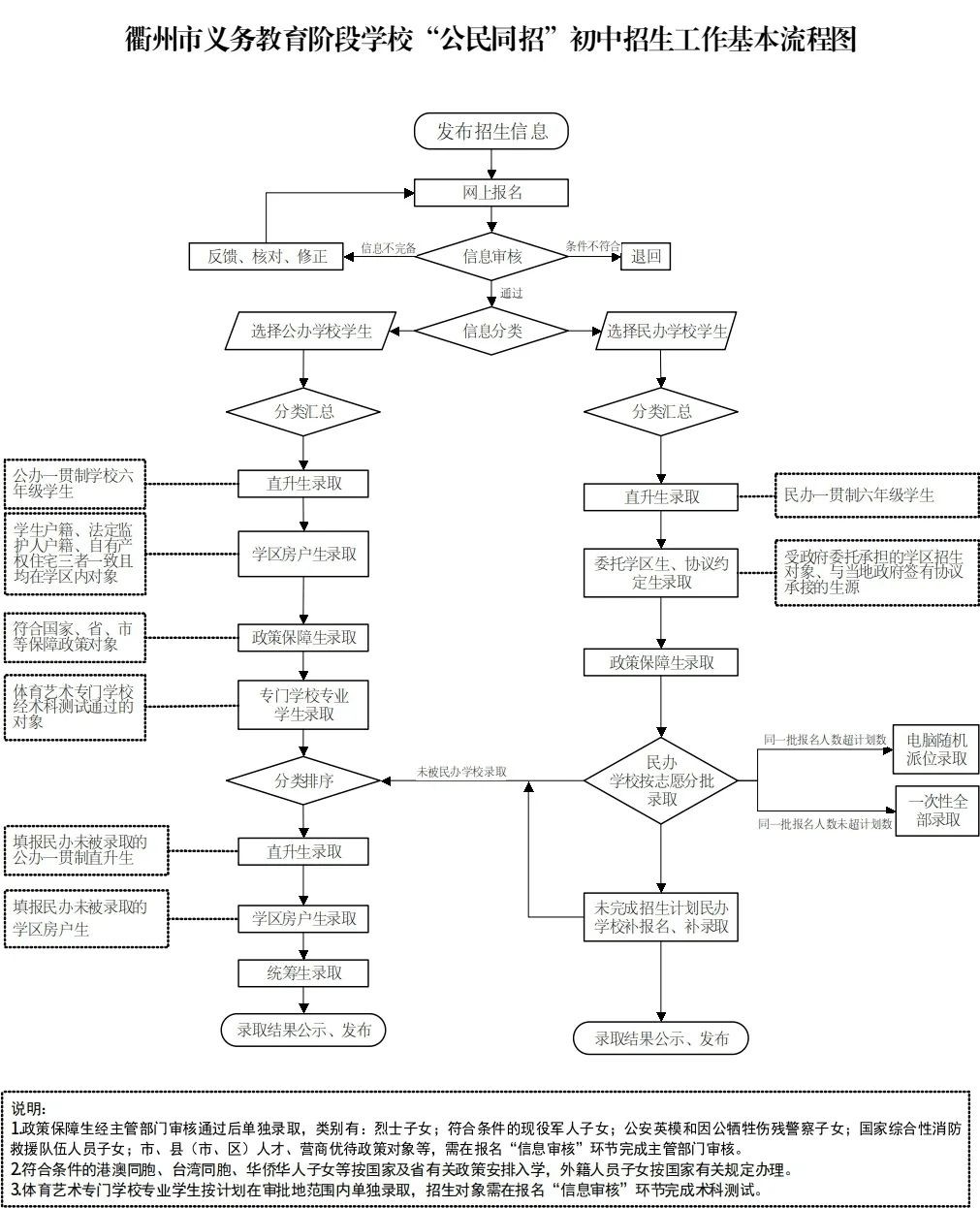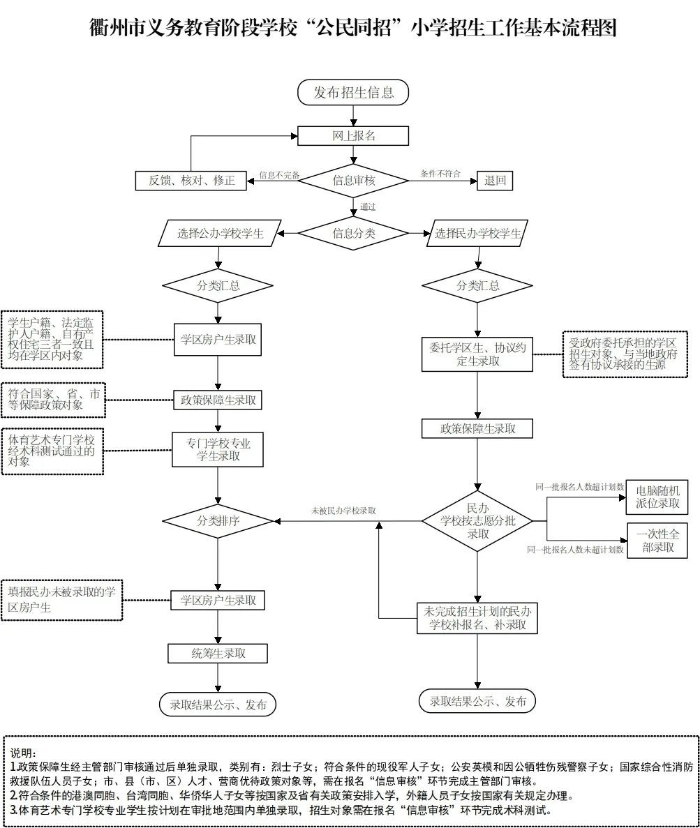 11.符合入學條件的適齡兒童少年的法定監(jiān)護人在規(guī)定的時間內登錄各縣(市、區(qū))義務教育學校招生入學管理平臺登記入學信息,完成報名程序。每位學生只能選擇一個縣(市、區(qū))入口報名。法定監(jiān)護人需確認閱讀學校招生簡章、收費標準等信息后方能選報相應學校。為推進市區(qū)一體化發(fā)展,對柯城區(qū)、衢江區(qū)戶籍人員跨區(qū)購房的對象有跨區(qū)入學需求的,可參照隨遷子女政策參加入學報名,兩區(qū)教育局視學位供給情況統(tǒng)籌錄取,具體辦法由兩區(qū)教育局根據(jù)公開公平公正的原則制定并報市教育局審核備案后與當?shù)卣猩ぷ鞣桨竿较蛏鐣肌?BR> 12.各縣(市、區(qū))教育局要規(guī)范適齡兒童少年申報就讀民辦學校的報名辦法和志愿填報辦法,每位適齡兒童少年可以在本學段面向本縣(市、區(qū))域招生的所有民辦學校中自主選擇若干所學校作為志愿,并根據(jù)自己的意愿明確志愿順序。要充分保障適齡兒童少年和家長的選擇權,教育行政部門及公辦學校不得對符合條件的適齡兒童少年報名就讀民辦學校設置任何限制條件;民辦學校也不得設置任何限制條件,拒絕或變相拒絕符合條件的適齡兒童少年入學報名。