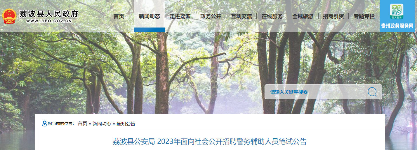 根據(jù)《荔波縣公安局 2023年面向社會(huì)公開(kāi)招聘警務(wù)輔助人員公告》規(guī)定,經(jīng)研究,筆試工作定于2023年12月23日(星期六)9:00進(jìn)行。現(xiàn)將有關(guān)事項(xiàng)公告如下: