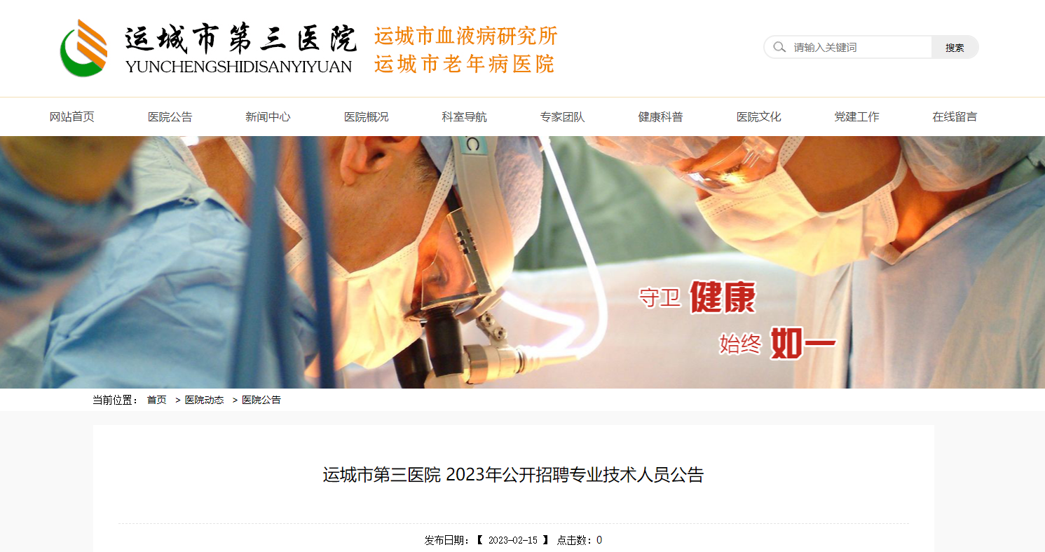 2023山西運(yùn)城市第三醫(yī)院招聘專業(yè)技術(shù)人員39人,報(bào)名時(shí)間:2023年2月24日8:00至3月2日17:00,現(xiàn)將招聘公告原文發(fā)布如下: