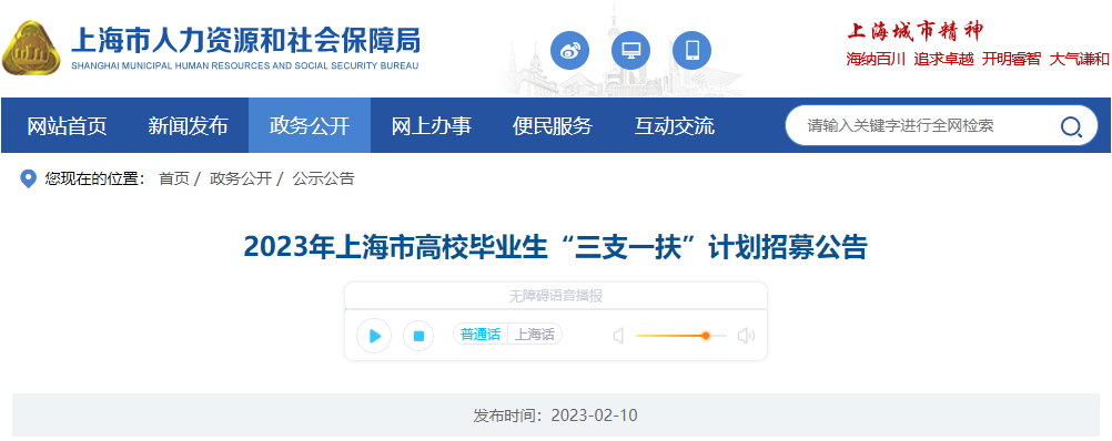 從上海市人力資源和社會(huì)保障局獲悉,2023年上海市高校畢業(yè)生“三支一扶”計(jì)劃招募公告已公布,報(bào)名時(shí)間:2月13日-17日,考試時(shí)間:3月25日,更多事宜請(qǐng)參考閱讀《考試公告》,官方公告原文如下: