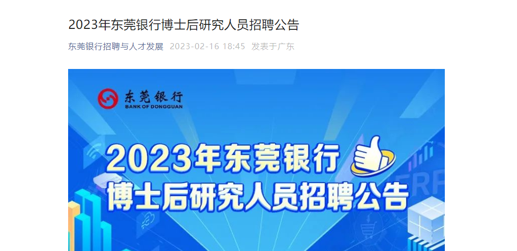 原文標(biāo)題:2023年東莞銀行博士后研究人員招聘公告