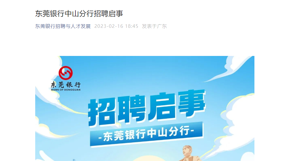2023年東莞銀行廣東中山分行招聘公告已發(fā)布,簡歷投遞截止時間:2023年2月28日,現(xiàn)將招聘公告發(fā)布如下:
