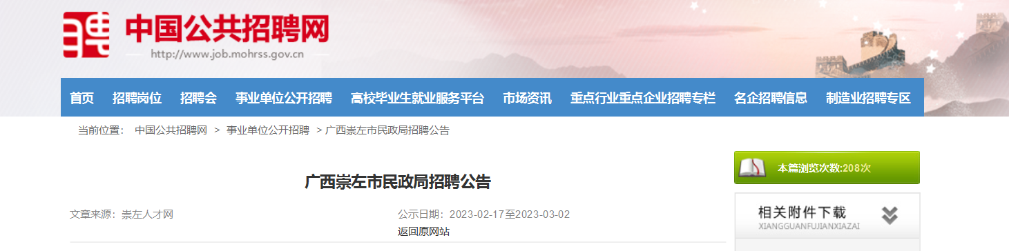 2023年廣西崇左市民政局招聘工作人員。報(bào)名時(shí)間:2023年2月17日—2023年3月2日?,F(xiàn)將公告原文發(fā)布如下: