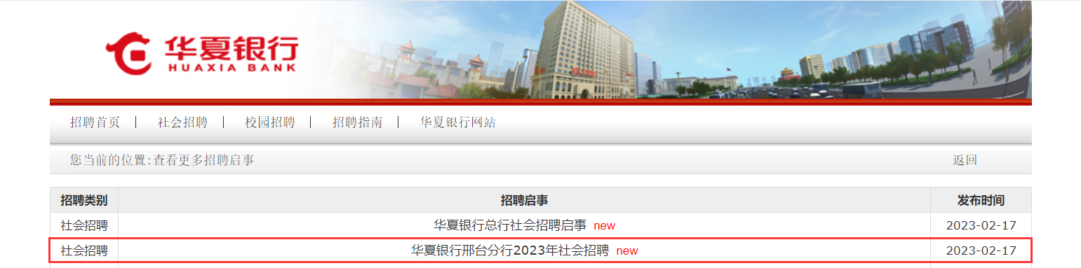 2023年華夏銀行河北邢臺分行社會招聘啟事已發(fā)布,報名時間:2023年3月10日24時截止,現(xiàn)將招聘公告發(fā)布如下: