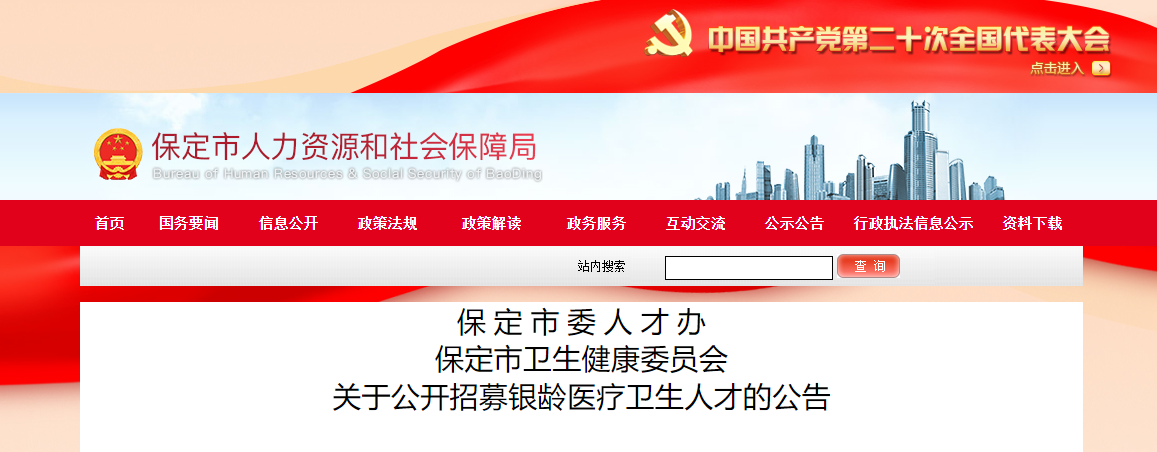 為深入貫徹落實(shí)黨的二十大、省委十屆三次全會和市委十二屆四次全會精神,進(jìn)一步推動全市醫(yī)療衛(wèi)生事業(yè)高質(zhì)量發(fā)展,決定實(shí)施保定市“銀齡健康醫(yī)療計劃”,面向京津等地引進(jìn)一批退休高級醫(yī)療衛(wèi)生人才。首批公開招募銀齡醫(yī)療衛(wèi)生人才49名?,F(xiàn)將有關(guān)事項(xiàng)公告如下: