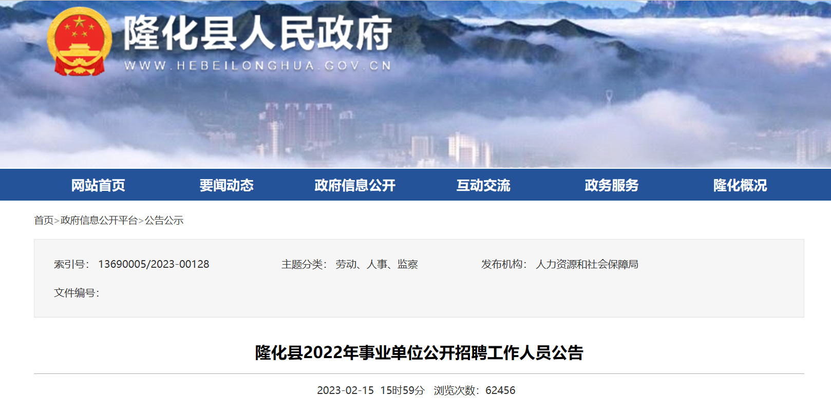 2022年河北省承德市隆化縣事業(yè)單位招聘261人。報名時間:2023年2月20日8:30至2023年2月24日17:30?,F(xiàn)將公告原文發(fā)布如下:
