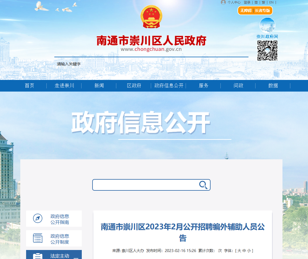 2023年2月江蘇省南通市崇川區(qū)招聘編外輔助人員3人。報(bào)名時(shí)間:2023年2月20日—2023年2月21日(上午9:00~17:30),逾期不予受理。現(xiàn)將公告原文發(fā)布如下: